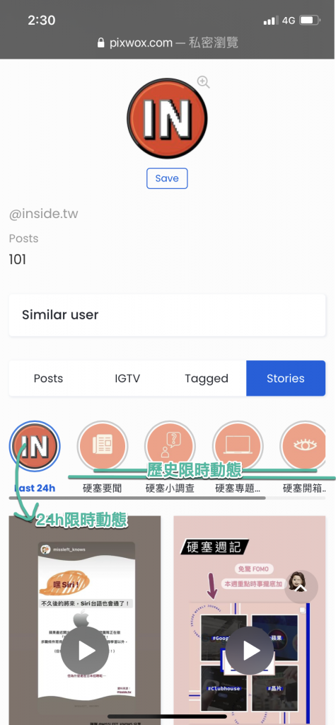 pixwox.com則有1個無法查看,stories-ig.net全部都正常顯示,但需要時間等待載入完畢